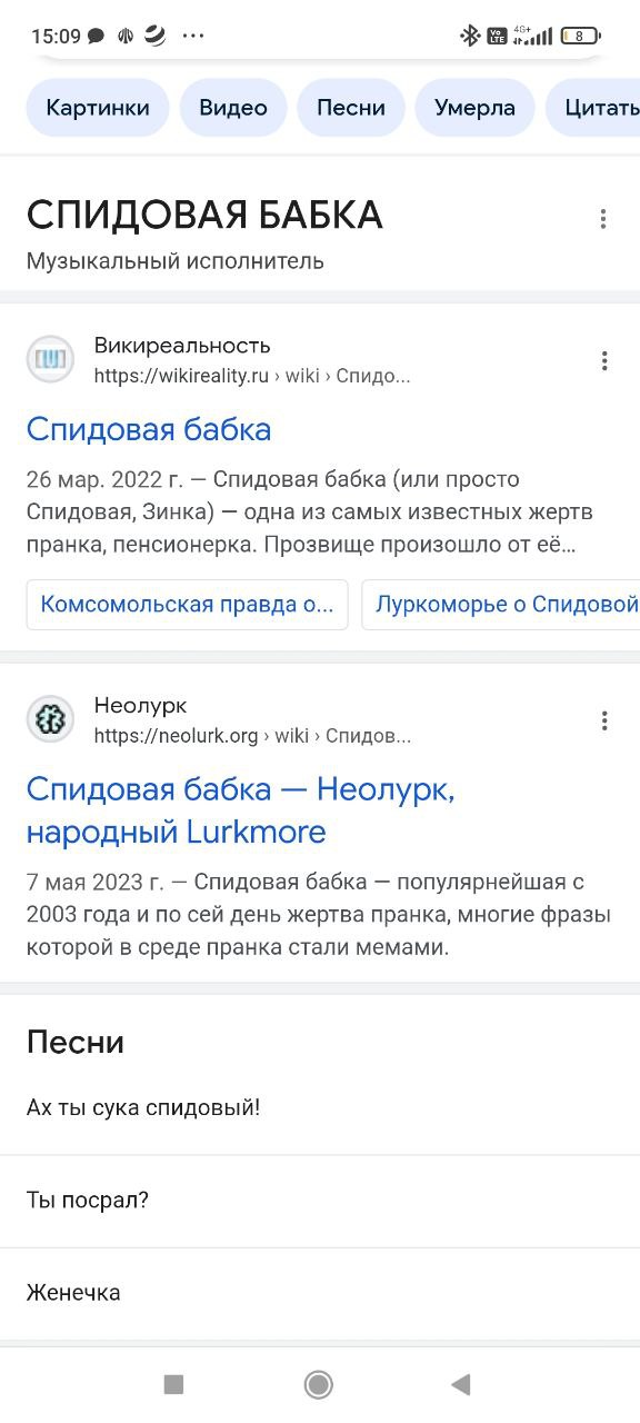 Результаты поисковой выдачи Google На чтение 1 мин Просмотров 32 Опубликовано 24.08.2023 Обновлено 27.11.2025 Тем временем Спидовая Бабка в гугл-поиске обозначается не иначе как Музыкальный исполнитель. Обсудить новость на форуме Перейти в бот с пранками Памяти жертв пранкаПриколыСпидоваяПохожие материалы Выдержка про пранк из книги Наследники известных жертв пранка Улучшения в RusPrankBot Пранки с Барри Алибасовым Новый пранк с питерской жертвой Спидовая и пранкеры на Russia Today Раритеты со Спидовой Альбом Коли Паралепипеда Первое видео со Спидовой Спидовая навсегда!